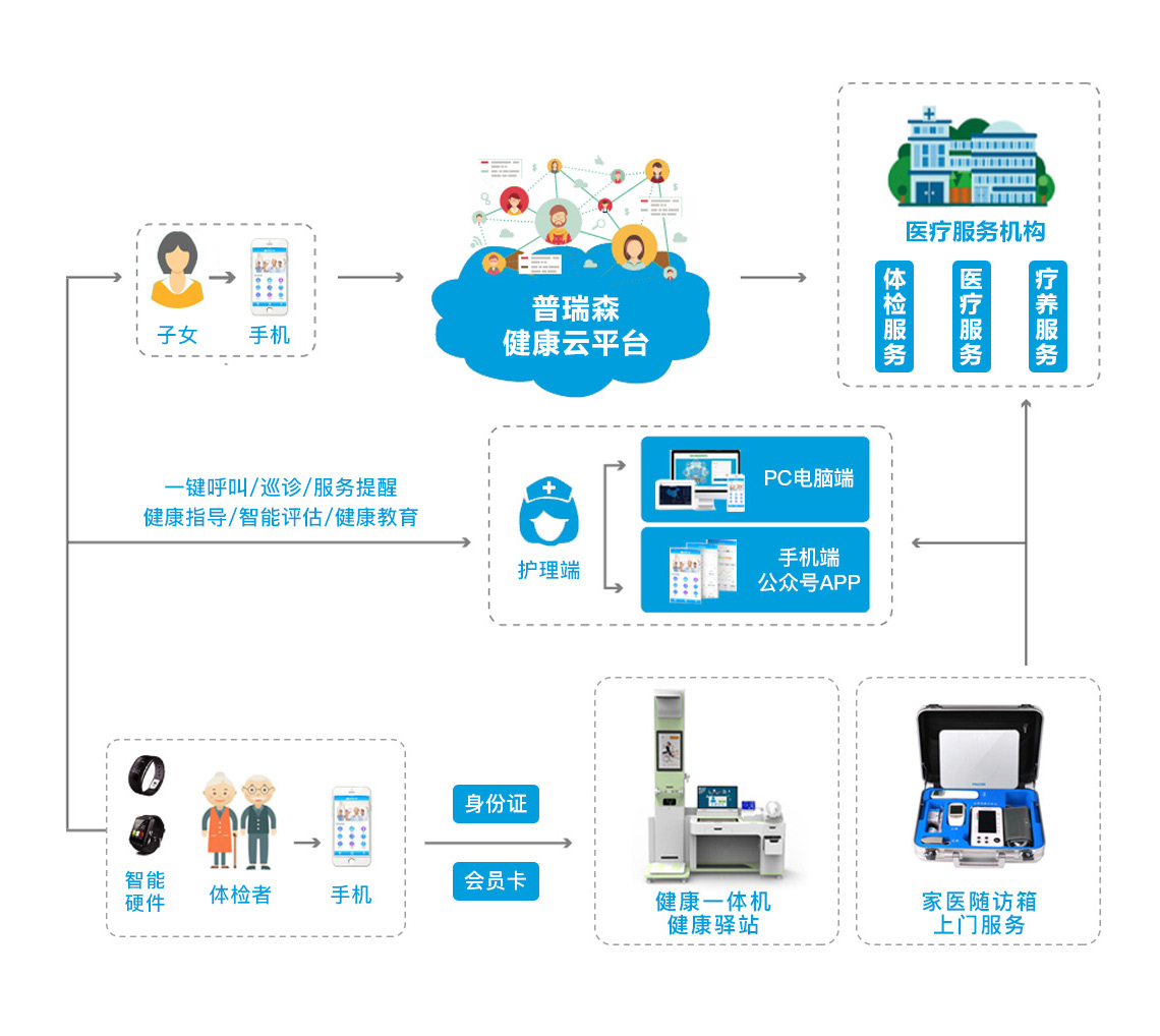 普瑞森·智慧養老解決方案運用各種先進的信息技術(物聯網、互聯網、移動互聯網技術、智能呼叫、云技術、GPS定位技術等),創建“系統+服務+老人+終端”的智慧醫養服務模式,并且涵蓋了機構養老、居家養老、社區日間照料等多種養老形式。 通過跨終端的數據互聯及同步,連通各部門及角色,形成一個完整的智慧管理閉環,實現老人與子女、服務機構、醫護人員的信息交互,對老人的身體狀態,安全情況和日常活動進行有效監控,及時滿足老人在生活、健康、安全、娛樂等各方面的需求。